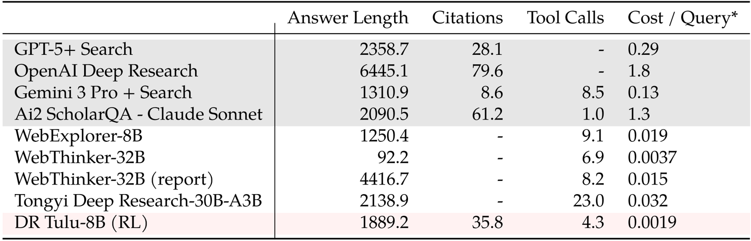 - High Efficiency and Performance: Despite being an 8B parameter model, DR Tulu outperforms larger open models (up to 30B) and matches proprietary systems like OpenAI Deep Research while reducing inference costs by nearly three orders of magnitude.