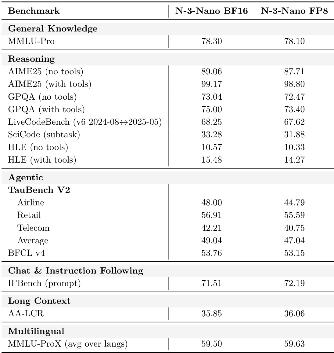 The authors use post-training quantization to convert Nemotron 3 Nano from BF16 to FP8 and report accuracy comparisons across multiple benchmarks. Results show the FP8 model retains approximately 99% median accuracy relative to the BF16 version, with minor performance trade-offs in specific reasoning and agentic tasks. The quantized model maintains strong performance in chat, long-context, and multilingual benchmarks while enabling higher inference throughput.