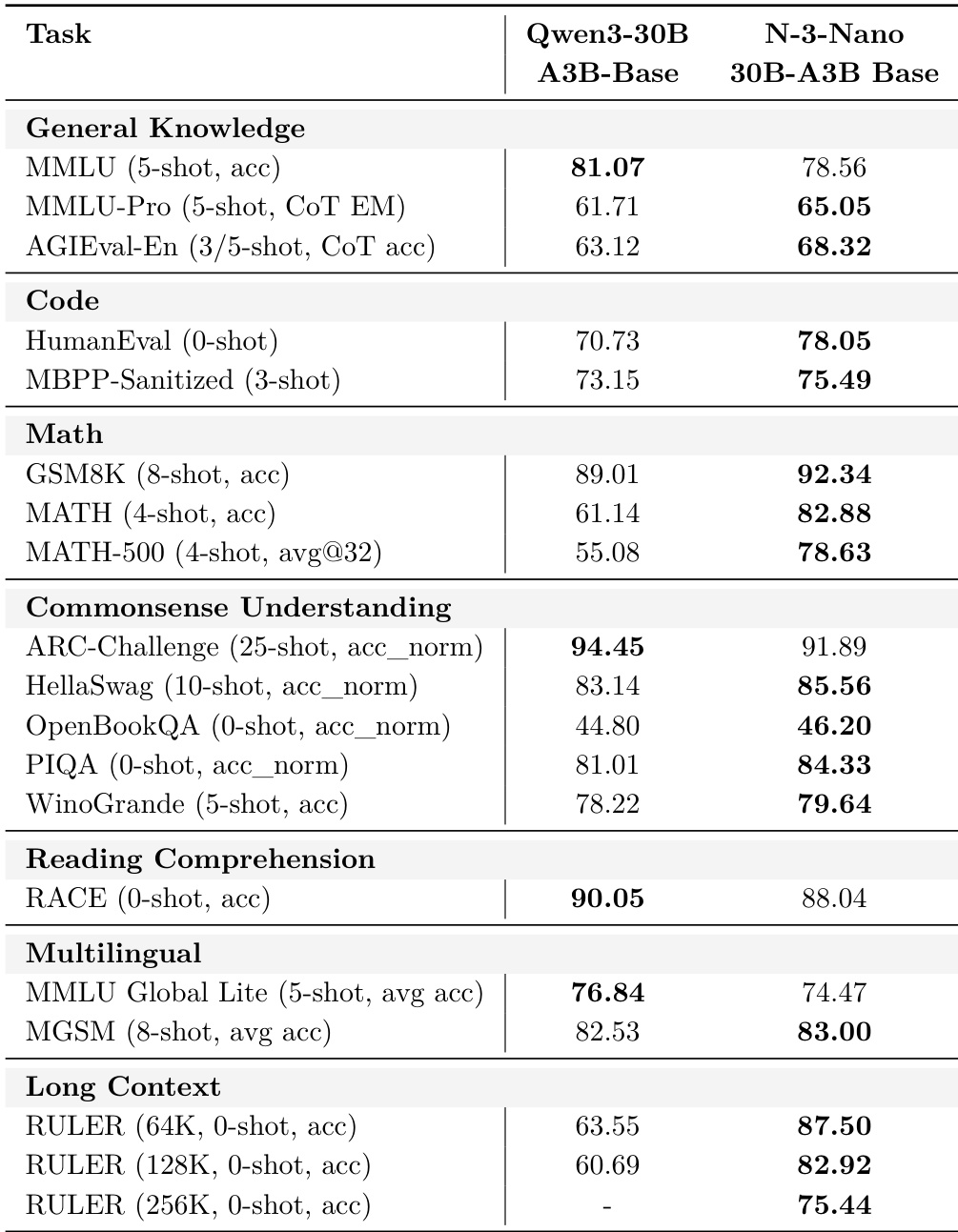 - Base model evaluations showed it surpassed Qwen3-30B-A3B-Base on Code, Math, and General Knowledge benchmarks including MMLU and GPQA, with significant gains on MMLU-redux CoT (+5.27 average accuracy).