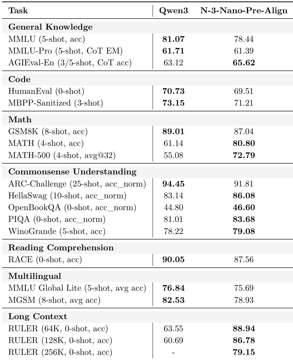 The authors compare the pre-alignment base checkpoint of Nemotron 3 Nano with Qwen3-30B-A3B-Base across multiple benchmarks, showing that while Qwen3 leads in general knowledge and multilingual tasks, Nemotron 3 Nano outperforms it in math, commonsense understanding, and long-context reasoning. Results indicate Nemotron 3 Nano’s pre-alignment base exhibits stronger performance on math and reading comprehension, and significantly higher scores on RULER at 64K and 128K context lengths. The comparison highlights trade-offs in early-stage model capabilities, with Nemotron 3 Nano showing particular strength in structured reasoning and long-context tasks despite trailing in some knowledge and multilingual benchmarks.