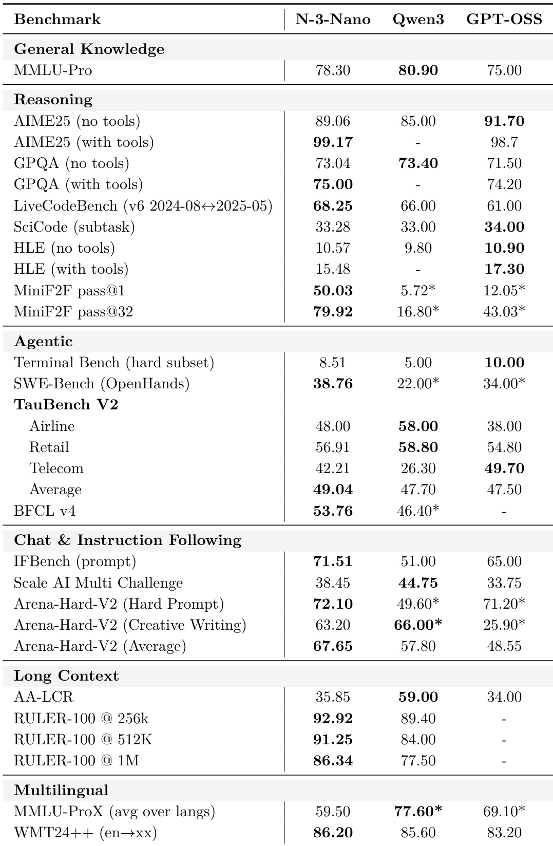 Results show Nemotron 3 Nano outperforms Qwen3-30B-A3B-Thinking-2507 and GPT-OSS-20B on agentic benchmarks like Terminal Bench and SWE-Bench, and leads in long-context tasks such as RULER-100 at 256K and 1M tokens. It also achieves competitive scores in reasoning and chat categories, with strong performance on IFBench and Arena-Hard-V2, while matching or exceeding Qwen3 in multilingual translation tasks. The model demonstrates consistent superiority in tool-augmented and instruction-following scenarios, particularly where structured outputs or environment constraints are required.