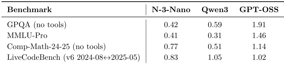 The authors evaluate Nemotron 3 Nano against Qwen3 and GPT-OSS on four reasoning and coding benchmarks, reporting scores normalized to a common scale. Results show Nemotron 3 Nano outperforms Qwen3 on all four benchmarks and significantly underperforms GPT-OSS, which achieves the highest scores across the board. The data reflects Nemotron 3 Nano’s strong relative performance among open models but highlights GPT-OSS as the current leader in these specific tasks.