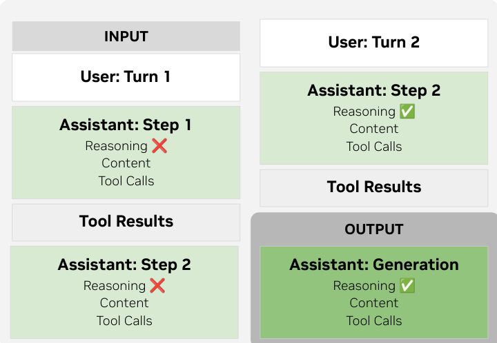 For post-training, the model supports reasoning control via a structured chat template that enables multi-step and multi-turn reasoning flows. In multi-step scenarios, reasoning tokens from prior steps are preserved to allow continuity, while in multi-turn interactions, prior reasoning is discarded upon new user input. Tool calls are formatted using XML-style tags to minimize escaping overhead, following conventions from GLM-4.5 and Qwen3-Coder. As shown in the figure below, the template materializes only the current turn’s reasoning into the prompt during generation, ensuring context relevance while preserving state across steps.