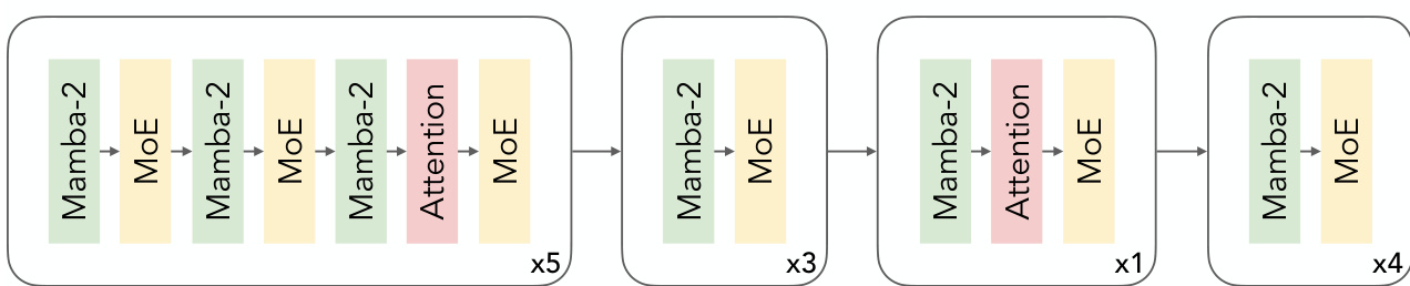 Refer to the framework diagram, which illustrates the block composition of the model. The architecture alternates between Mamba-2 blocks and MoE layers, with attention layers strategically placed at specific intervals. The sequence begins with five repetitions of a block containing Mamba-2, MoE, Mamba-2, MoE, Mamba-2, Attention, MoE. This is followed by three repetitions of a block with Mamba-2, MoE, Attention, MoE. A single instance of Mamba-2, Attention, MoE follows, and the sequence concludes with four repetitions of Mamba-2, MoE. This layered structure balances state-space modeling with attention-based context capture, while MoE enables dynamic expert selection for computational efficiency.