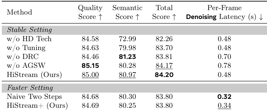 The authors evaluate HiStream’s ablation variants and find that removing Dual-Resolution Caching or Anchor-Guided Sliding Window increases latency to 0.70s and 0.78s respectively, while maintaining the full HiStream configuration achieves the highest total score of 84.20 at 0.48s per frame. In the faster setting, HiStream+ reduces latency to 0.34s with minimal quality loss compared to a naive two-step approach, which achieves 0.32s but lacks the asymmetric denoising strategy that preserves initial chunk fidelity.