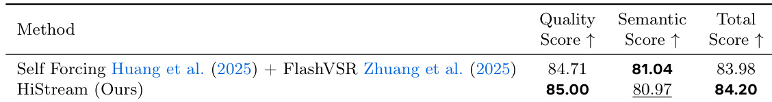 HiStream achieves a higher Quality Score and Total Score compared to the two-stage super-resolution approach of Self Forcing combined with FlashVSR, demonstrating superior detail fidelity in native high-resolution generation. The Semantic Score remains competitive, indicating strong alignment with input prompts despite the absence of dedicated super-resolution post-processing.