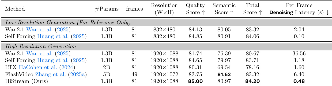 The authors use HiStream to generate high-resolution videos at 1920×1088, achieving the highest Quality Score (85.00) and Total Score (84.20) among compared methods while maintaining the lowest per-frame denoising latency of 0.48 seconds. Results show HiStream outperforms baselines including Wan2.1, Self Forcing, LTX, and FlashVideo in both visual fidelity and efficiency, with its latency representing a 76.2× speedup over Wan2.1. The model also achieves the best Semantic Score (80.97), indicating strong alignment between generated content and input prompts.