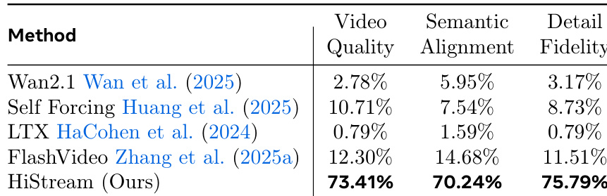 The authors use HiStream to generate high-resolution videos and evaluate it against several baselines using user preference metrics. Results show HiStream receives 73.41% of votes for video quality, 70.24% for semantic alignment, and 75.79% for detail fidelity, significantly outperforming all compared methods. This indicates HiStream produces videos that users perceive as higher quality, more semantically accurate, and richer in fine detail.