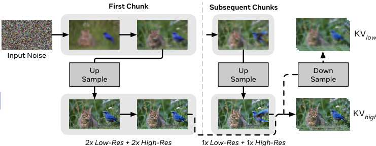 Refer to the framework diagram illustrating the dual-resolution denoising process. The first chunk undergoes a full 2x low-res + 2x high-res denoising path, while subsequent chunks use an accelerated 1x low-res + 1x high-res path. Crucially, after high-resolution refinement, the output is downsampled and used to update the low-resolution KV cache, ensuring spatial consistency for the next chunk. This dual KV caching mechanism prevents misalignment between cached features and the final high-resolution output, preserving spatio-temporal coherence.