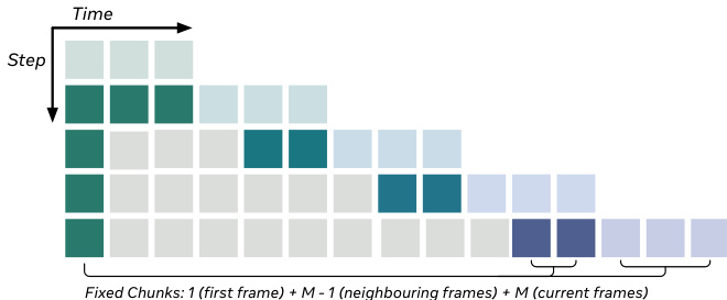 As shown in the figure below, the attention window is composed of a fixed anchor (first frame), recent local context, and the current chunk, ensuring constant computational cost per generation step.