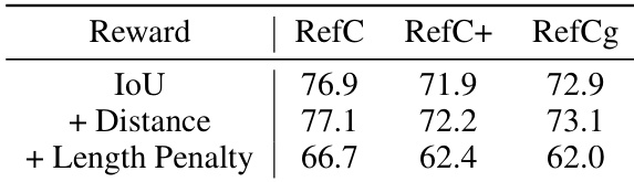 Results show that adding a distance reward improves performance across all datasets, increasing the gIoU score by approximately 0.2. However, incorporating a length penalty degrades performance, indicating that hard constraints on sequence length are detrimental to segmentation accuracy.