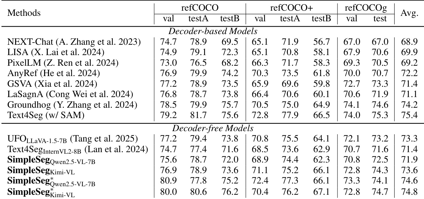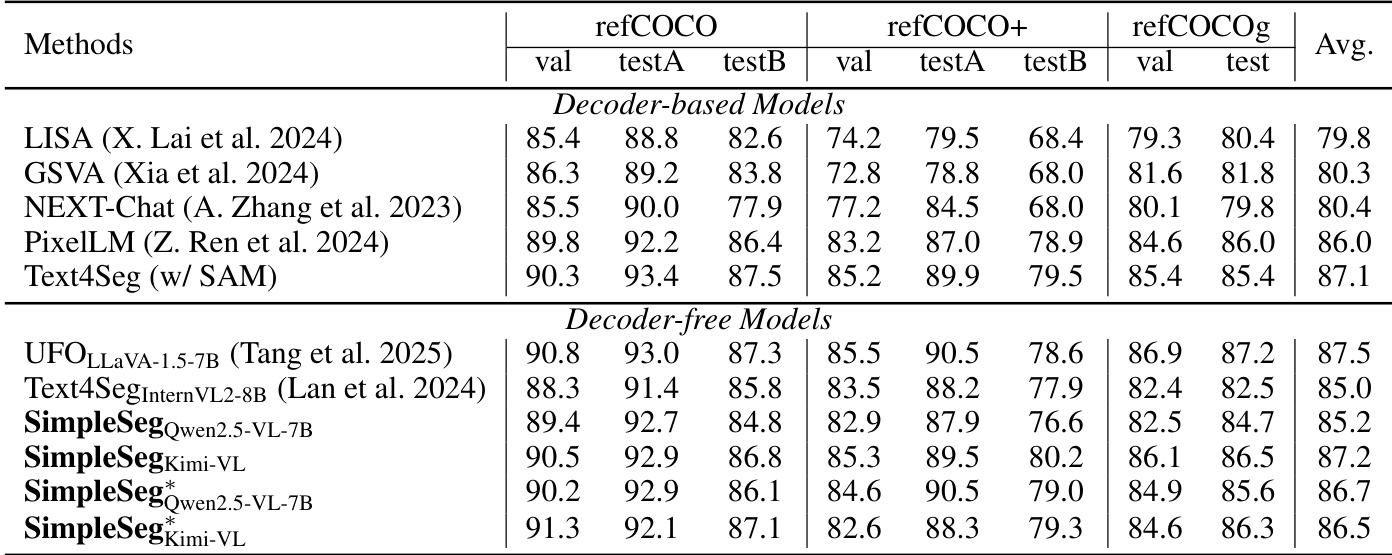 - On benchmarks like refCOCO, SimpleSeg matches or exceeds the performance of complex, task-specific approaches, demonstrating strong generalization across domains and resolutions while preserving interpretability and compositional reasoning.