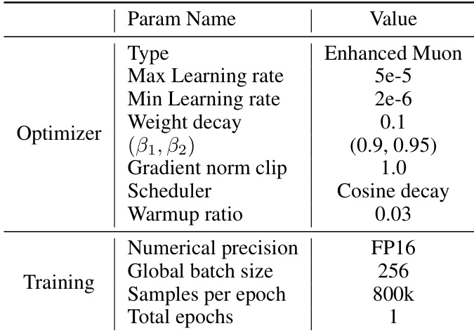 The authors use the Enhanced Muon optimizer with a max learning rate of 5e-5, a min learning rate of 2e-6, and a cosine decay scheduler with a warm-up ratio of 0.03. Training is conducted with a global batch size of 256 and 800k samples per epoch over one total epoch.