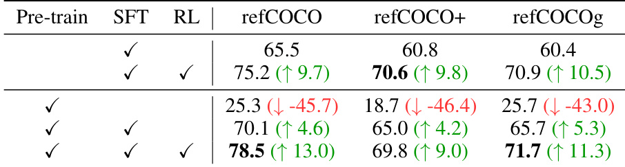 Results show that the combination of supervised fine-tuning and reinforcement learning significantly improves performance on referring expression segmentation, with the full training pipeline achieving the highest scores across all datasets. The ablation study indicates that reinforcement learning provides the largest gain, while pre-training alone is ineffective without subsequent fine-tuning.