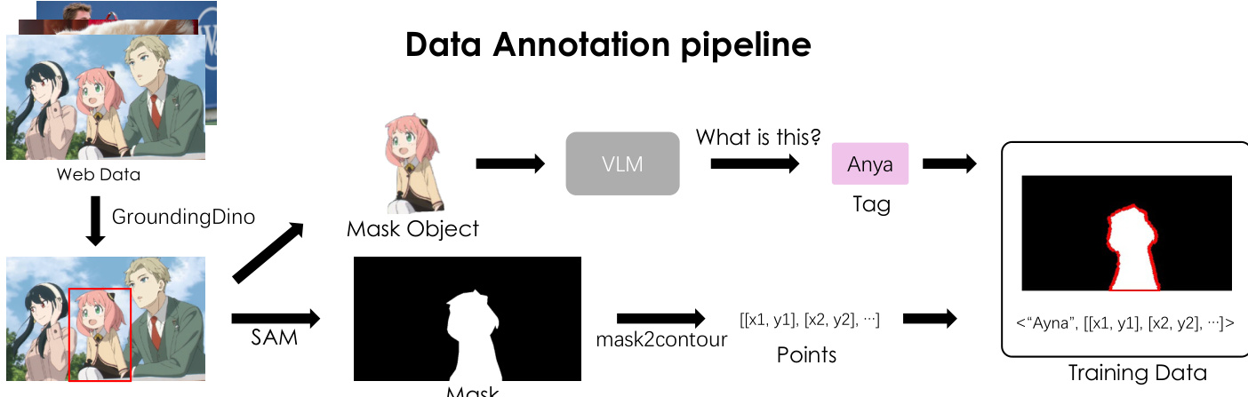 The data annotation pipeline, as illustrated in the figure below, is designed to scale the framework using large-scale web data. It begins with web data, which is processed by Grounding-DINO for object detection to identify instances. The detected objects are then passed to SAM to generate segmentation masks. These binary masks are converted into polygonal contours using a contour extraction algorithm, which enforces a consistent clockwise traversal order and optionally applies sparsification. The resulting point sequences are combined with textual descriptions, generated by a vision-language model (VLM), to form structured training data. This pipeline enables the creation of diverse instruction-response pairs for training, where the model learns to generate the appropriate point trajectory given a textual prompt.