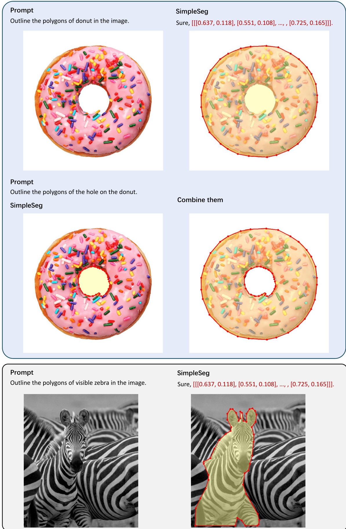 - SimpleSeg enables MLLMs to perform pixel-level segmentation by predicting sequences of textual coordinates that outline object boundaries, eliminating the need for specialized decoders or auxiliary components while operating entirely within the language space.
