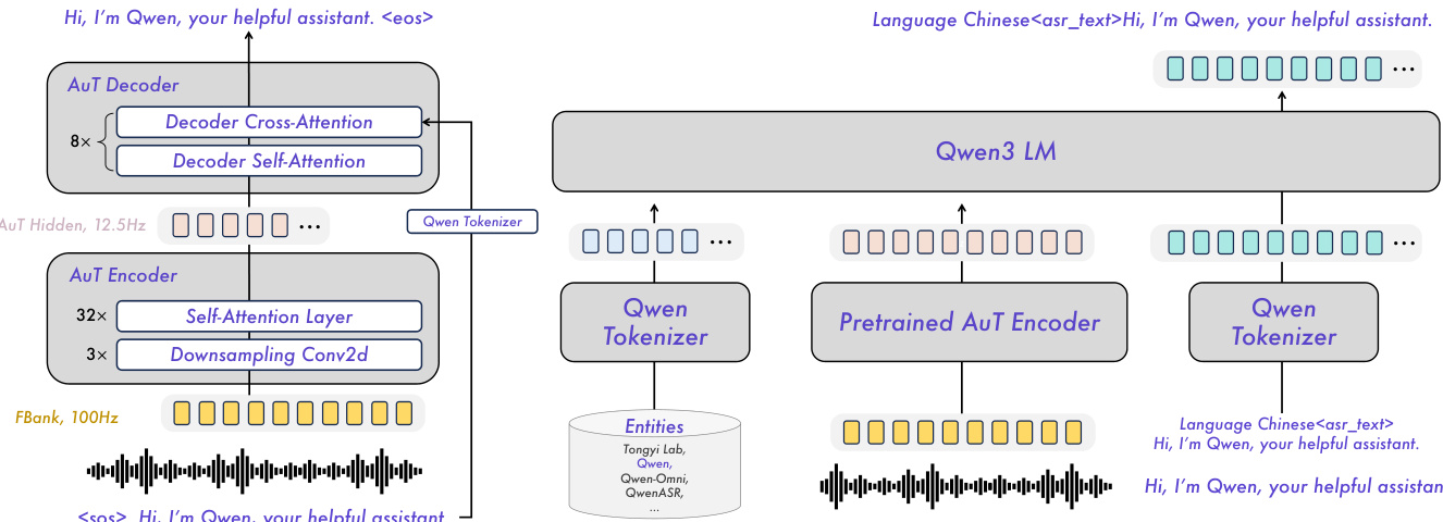 As shown in the figure below, the overall framework illustrates the integration of the pretrained AuT encoder with the Qwen3 LLM, where speech is first encoded into a sequence of hidden states, then projected and fed into the language model for transcription. The decoder side of the AuT model, shown on the left, operates under the AED paradigm with cross-attention and self-attention layers, while the right side depicts the end-to-end Qwen3-ASR structure where the LLM directly generates text conditioned on the audio embeddings.