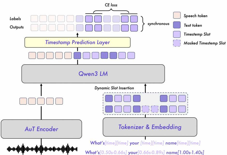 For forced alignment, Qwen3-ForcedAligner-0.6B reframes the task as slot filling: given a transcript augmented with [time] tokens marking word or character boundaries, the model predicts discrete timestamp indices for each slot. The architecture, as illustrated in the figure below, uses the same pretrained AuT encoder to extract speech embeddings, while the transcript is tokenized with [time] placeholders. These are discretized into indices based on the 80ms frame duration of the encoder output. The combined sequence is processed by the Qwen3-0.6B LLM, followed by a linear timestamp prediction layer that outputs indices for all slots simultaneously, supporting up to 300s of audio (3,750 classes).