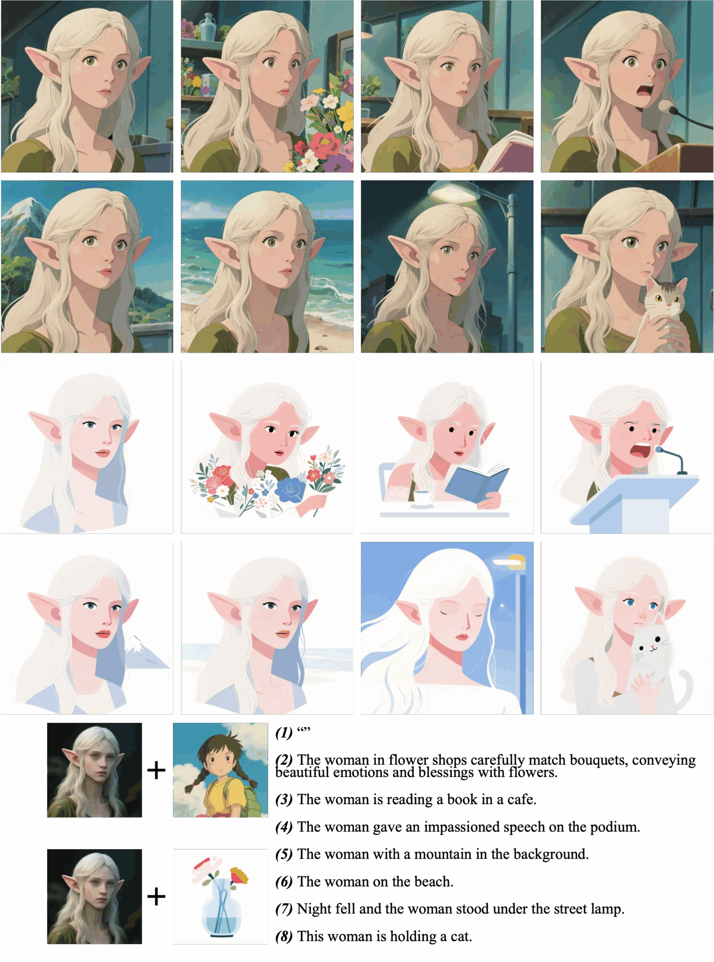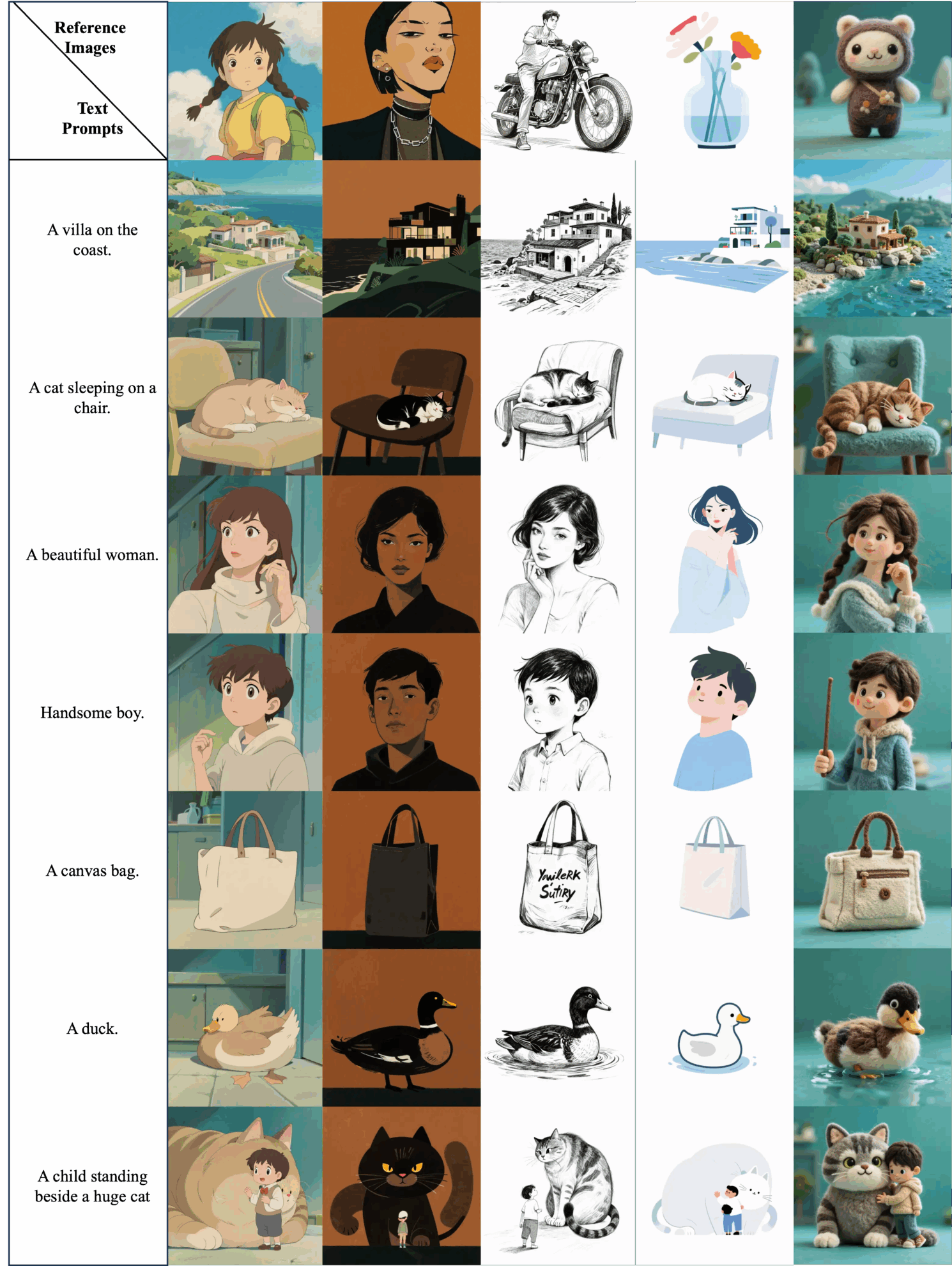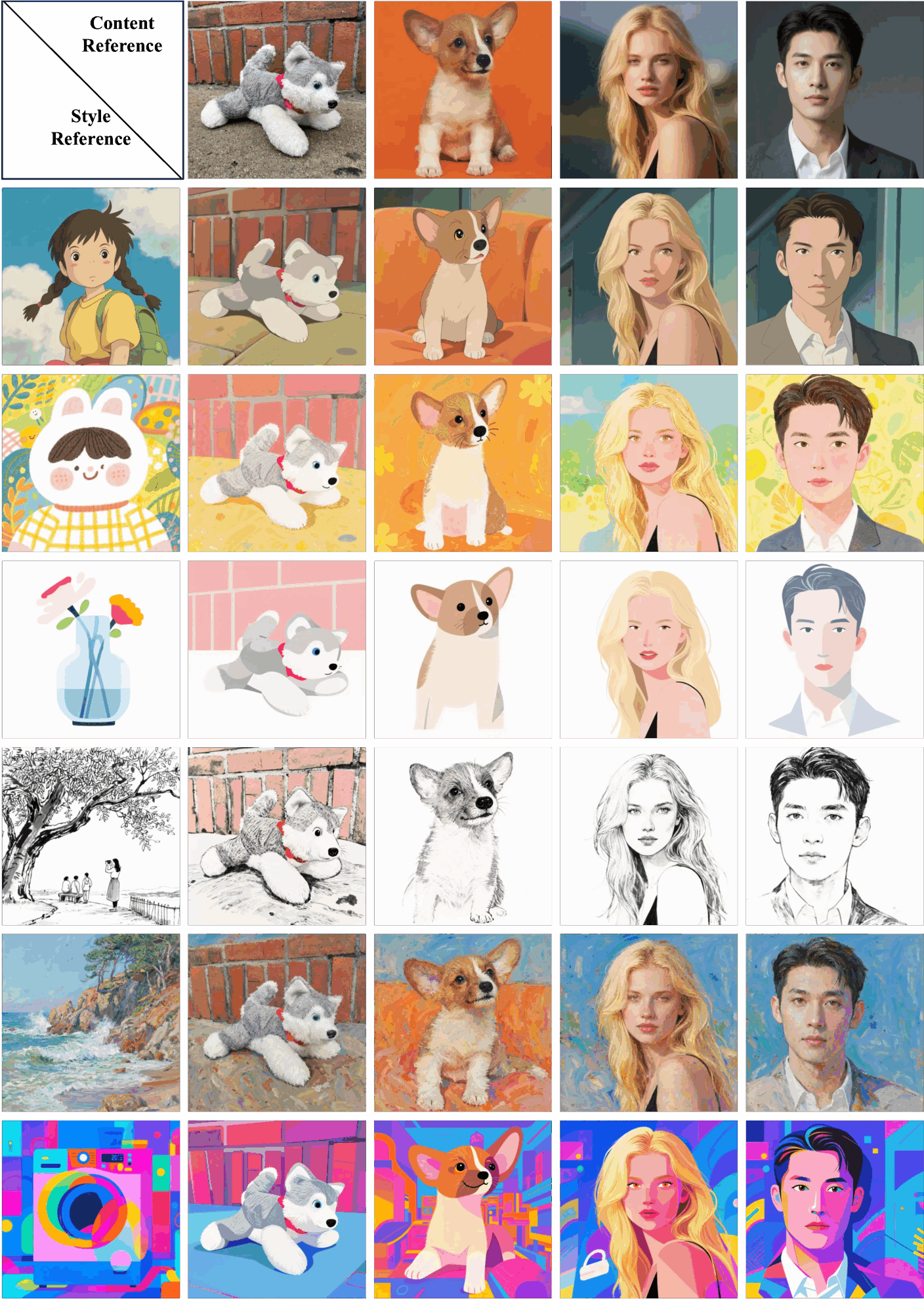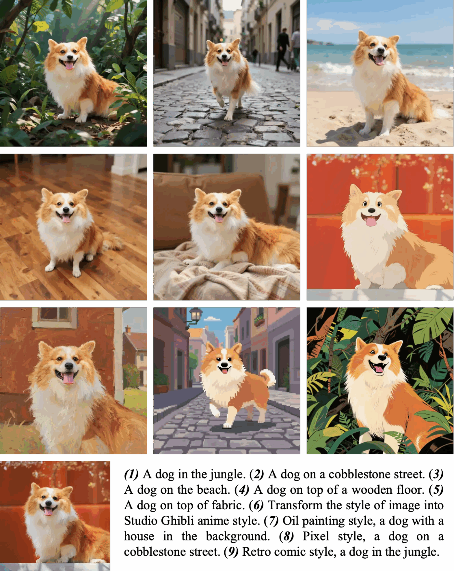 被写体を新しいシーンに配置する場合は、「犬/男性/女性が…している」といった自然な表現を使用してください。レイアウトを維持したままスタイルのみを変換したい場合は、「スタイルを…のスタイルに転送する」といったガイドキューを使用してください。ポートレート生成において、USOは肌のディテールが鮮明な画像の生成に優れています。実践ガイド:半身のキューには半身のクローズアップを使用し、ポーズや構図が大きく変わる場合は全身画像を使用してください。