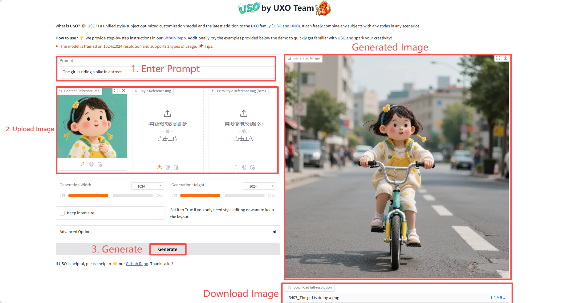 あなたのスタイルに合った画像を1枚か2枚アップロードし、自然な言葉で希望の画像を作成してください。USOはあなたの指示に従って、アップロードしたスタイルに合った画像を生成します。