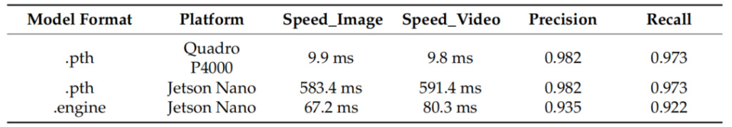 Model deployment environment:ARM-adapted Ubuntu 16.04 operating system, 4-core ARM A57 @ 1.43 GHz CPU, 128-core Maxwell architecture GPU, 4 GB memory, JetPack 4.5, Cuda10.2.89, Python 3.6, TensorRT 7.1, Opencv 4.1.1, CMake 3.21.2 deep learning environment.