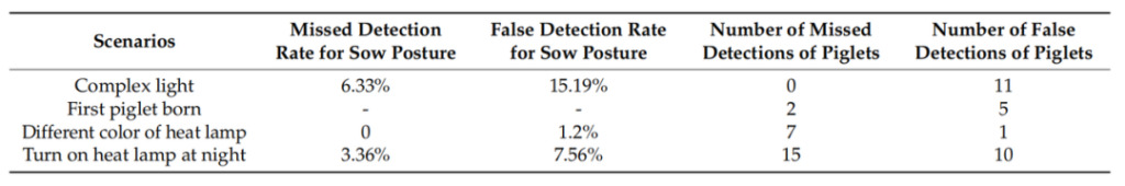 In order to test the generalization ability and anti-interference ability of the model, the experimental team retained one of the sows as a "new sample" when training the model, and selected 410 images containing different complex scenes to test the model. The results showed thatMissed detection and false detection of sow posture are mainly affected by changes in lighting; piglets are mainly affected by the turning on of heat lamps, that is, piglets are difficult to identify under strong light; the time when the first piglet is born and scenes of heat lamps of different colors have little effect on the detection ability of the model.