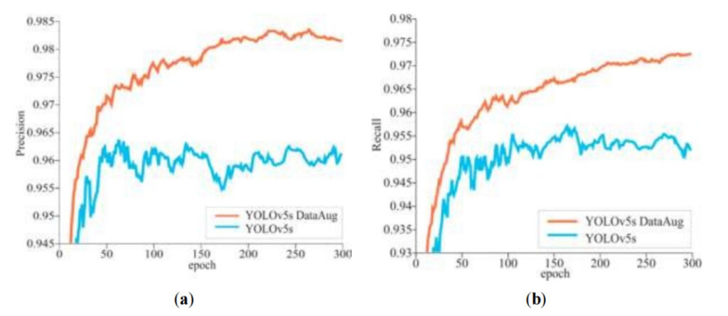 The experimental team found that in the 300 epochs of model training,As the iteration cycle increases, the precision and recall rate generally show an upward trend.At the same time, it can be found thatThe YOLOv5s model with data augmentation has consistently higher precision and recall.