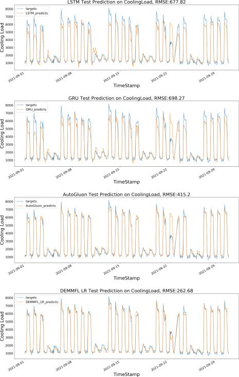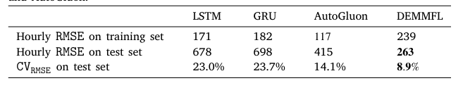 研究人员使用 LSTM 、 GRU 和 AutoGluon 等深度学习模型对同一训练数据集进行了优化,并在 2021 年 9 月的同一测试集上与 DEMMFL 模型进行比较。由于采用了知识驱动的工程化特征,DEMMFL 模型展现出了明显的优势,实现了最佳的 RMSE,而 AutoGluon 模型取得了次优。