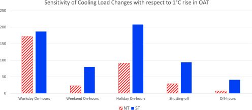 建立模型后,研究团队对每个模型中冷负荷相对于 OAT 的敏感性进行了评估。在保持其余变量不变的情况下,他们将 OAT 增加一摄氏度,并相应地计算其他与 OAT 相关的变量。