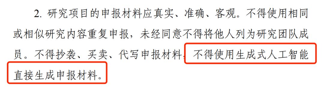 《指引》在研究选题与实施部分指出:科研人员研究项目的申报材料应真实、准确、客观。不得使用相同或相似研究内容重复申报,未经同意不得将他人列为研究团队成员。不得抄袭、买卖、代写申报材料,不得使用生成式人工智能直接生成申报材料。