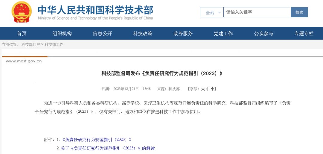 2023 年 12 月 21 日,科技部监督司发布《负责任研究行为规范指引(2023)》(以下简称《指引》),针对社会关注的人工智能、重大成果发布等热点问题,旗帜鲜明地划定了红线。