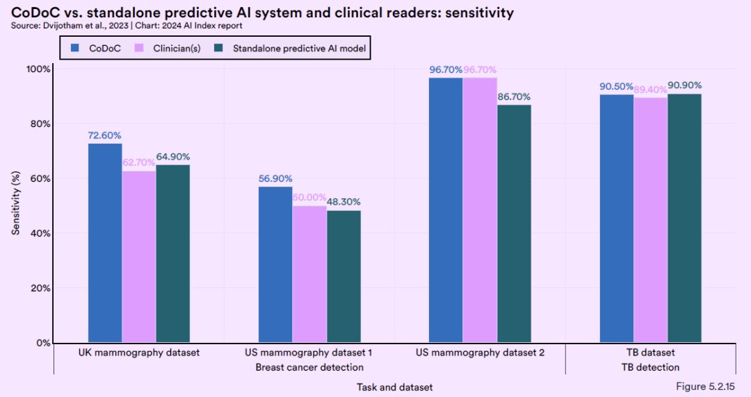 此外,DeepMind 利用多个真实世界的去识别化历史数据集对 CoDoC 系统进行了全面的测试。测试结果表明,将人类的医学专业知识与 AI 模型的预测相结合,能够提供最为精确的诊断方案,其准确性超越了单独使用任一方法所能达到的水平。这一发现强调了 AI 与人类专家协同工作的重要性,为提高医学成像诊断的准确性和可靠性提供了新的视角。