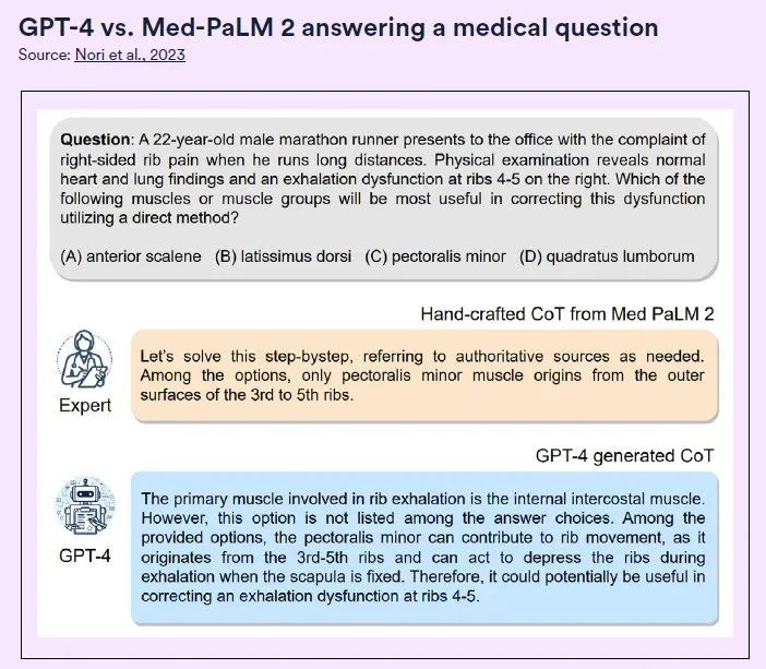 Medprompt 是多种提示策略的组合体,其包含了:* 动态少样本选择:研究人员先利用 text-embedding-ada-002 模型为每个训练样本和测试样本生成向量表示。然后,对于每个测试样本,基于向量相似度,从训练样本中挑选出最相似的 k 个样本。* 自生成思维链:思维链 (CoT) 方法就是让模型一步一步思考,生成一系列中间推理步骤。与在 Med-PaLM 2 模型中专家手工制作的思维链示例相比,GPT-4 生成的思维链基本原理更长,而且分步推理逻辑更细粒度。