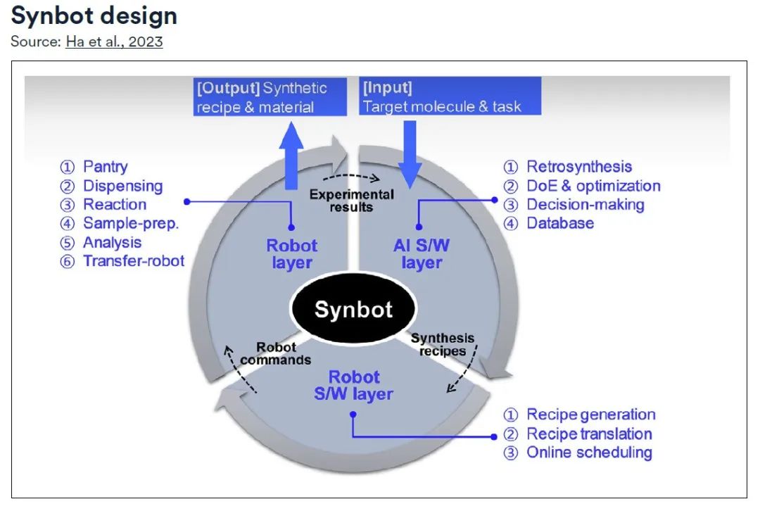 * 人工智能软件层 (AI S/W layer):引领综合规划过程,配备逆合成模块、实验设计和优化模块,并使用决策模块引导实验方向;