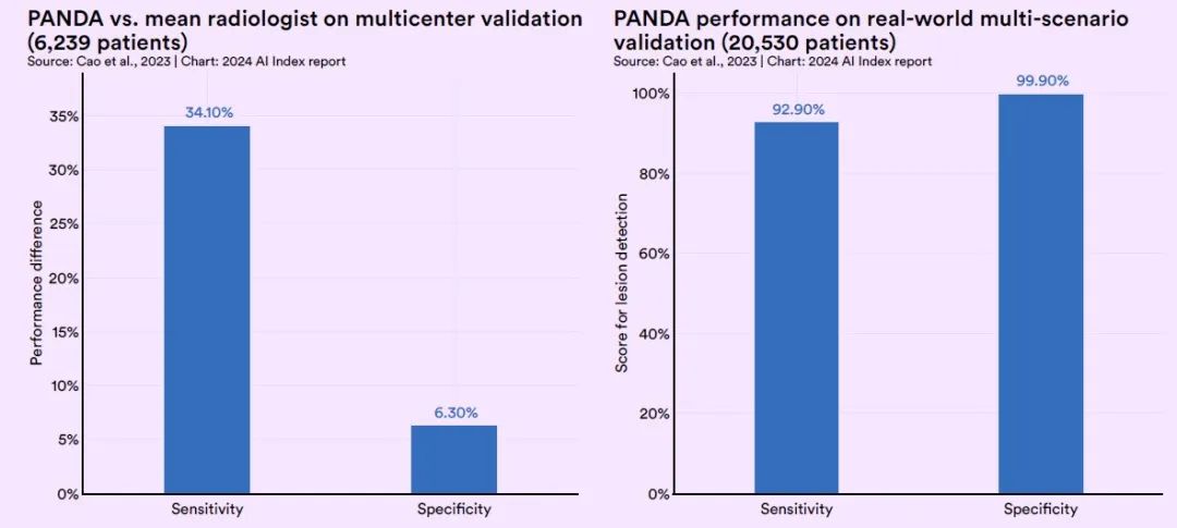 在验证试验中,PANDA 的灵敏度 (sensitivity) 比普通放射科医生高 34.1%,特异性 (specificity) 比普通放射科医生高 6.3% 。在一项涉及约 2 万名患者的大规模真实测试中,PANDA 的灵敏度为 92.9%,特异性为 99.9% 。(点击查看完整报道:在 2 万病例中识别出 31 例漏诊,阿里达摩院牵头发布「平扫 CT +大模型」筛查胰腺癌)