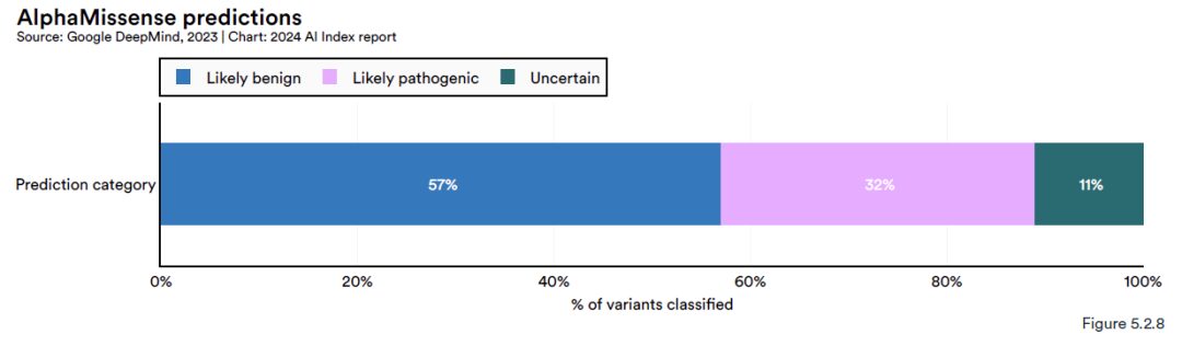 研究结果显示,AlphaMissense 成功预测了人类蛋白质编码基因中的 7,100 万个错义突变。错义突变是一种遗传性变异,能够影响蛋白质的功能,进而可能导致包括癌症在内的多种疾病。在这些潜在的错义变异中,AlphaMissense 能够对 89% 的变异进行分类,其中大约 57% 被判定为可能的良性变异 (Likely benign),32% 被判定为可能的致病性变异 (Likely pathogenic),而剩余的变异则被归类为不确定性质 (Uncertain) 。