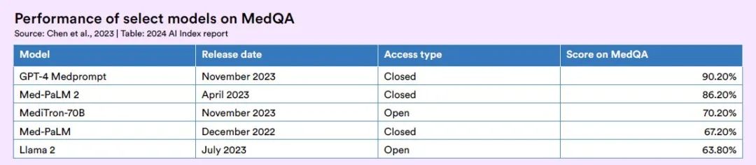 《2024 年人工智能指数报告》表明,AI 技术在医疗影像、医疗问答、医学诊断、等多领域取得成效。事实上,AI 在医疗健康领域的应用是早已为人们所熟知。通过机器学习算法,AI 能够分析大量的医疗数据,帮助医生更准确地诊断疾病。例如,在癌症检测中,AI 可以识别出医学影像中的微小异常,从而提高早期诊断的成功率。