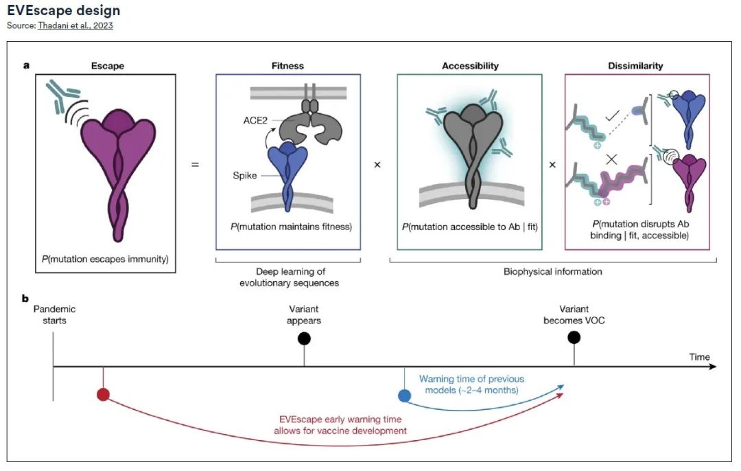 * 另一部分则是包含了病毒详细生物学和结构信息的数据库。通过整合这两个组件,EVEscape 能够预测病毒变种在实际出现之前的特征。