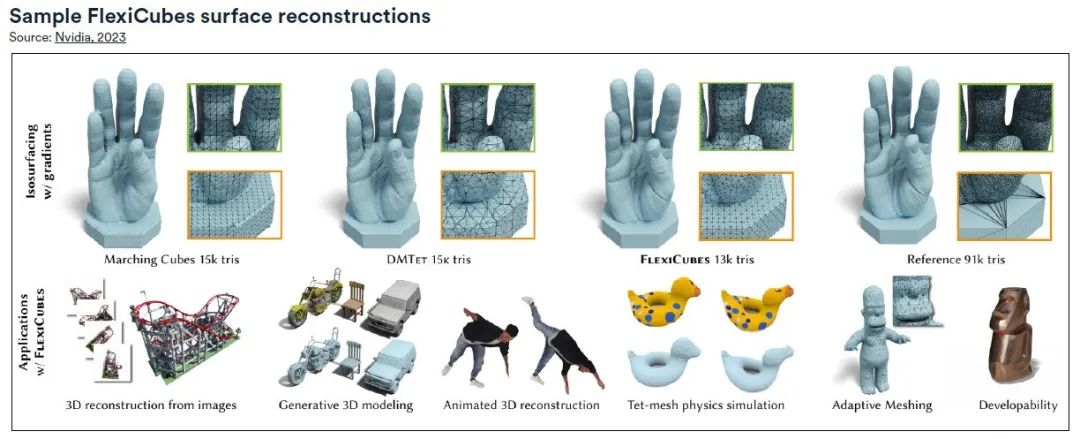 FlexiCubes 生成的高质量网格在表示复杂细节方面表现出色,增强了人工智能生成的 3D 模型的整体逼真度和保真度。这些网格尤其适用于物理模拟,在摄影测量和生成式 AI 等场中,使得 AI 管道准确呈现复杂形状中的细节成为可能。