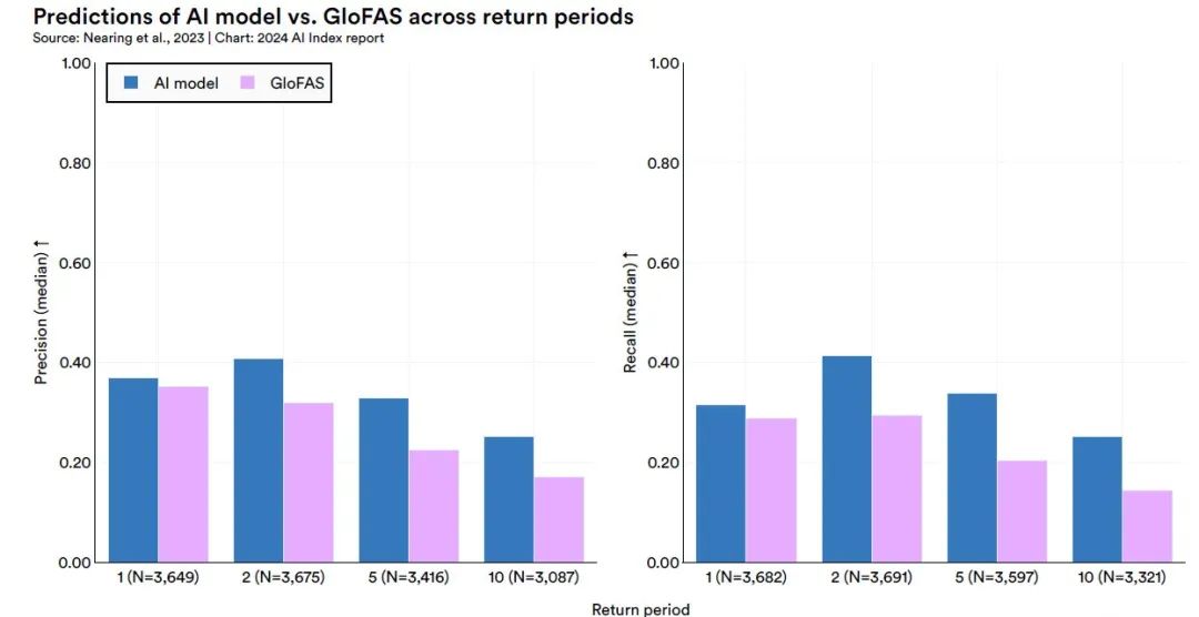 2018 年,谷歌启动了 Google Flood Forecasting Initiative,利用 AI 和强大算力打造更好的洪水预测模型,并与多国政府部门展开合作。 2023 年,谷歌的研究团队开发了一个基于机器学习的河流预报模型,该模型能够提前 5 天实现对洪水的可靠预测,在对 5 年一遇的洪水事件进行预测时,性能优于或相当于目前预测 1 年一遇的洪水事件,系统可覆盖 80 多个国家。
