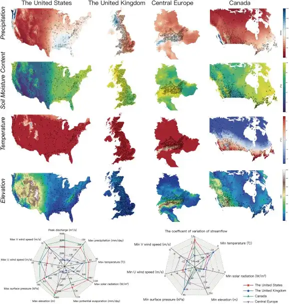 The training data set used in this study comes from 2,089 river basins in the United States (482 river basins), the United Kingdom (406 river basins), Central Europe (461 river basins), Canada (740 river basins), etc., as shown in the figure below: