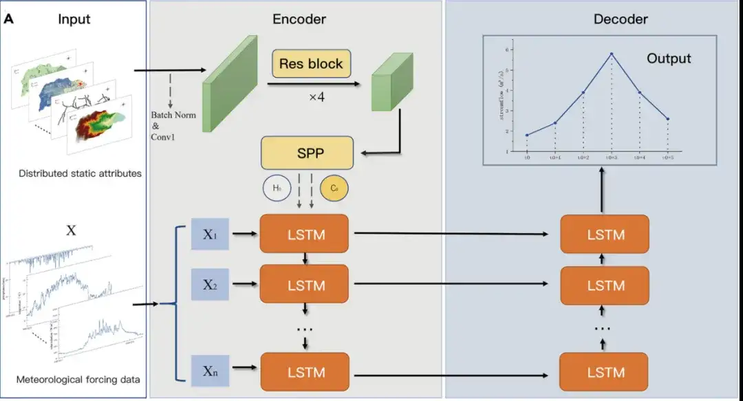 in,The Encoder combines static attributes with forcing data.Static data include digital elevation models (DEMs), snow cover extent, soil moisture content, groundwater depth, potential evapotranspiration, drought index and river channel geometry. These attributes guide the model to distinguish the hydrological behavior of different regions. Forced data include precipitation, solar radiation, air temperature, dew point temperature, surface pressure, easterly and northerly wind speeds. These data have a temporal resolution of 24 hours.