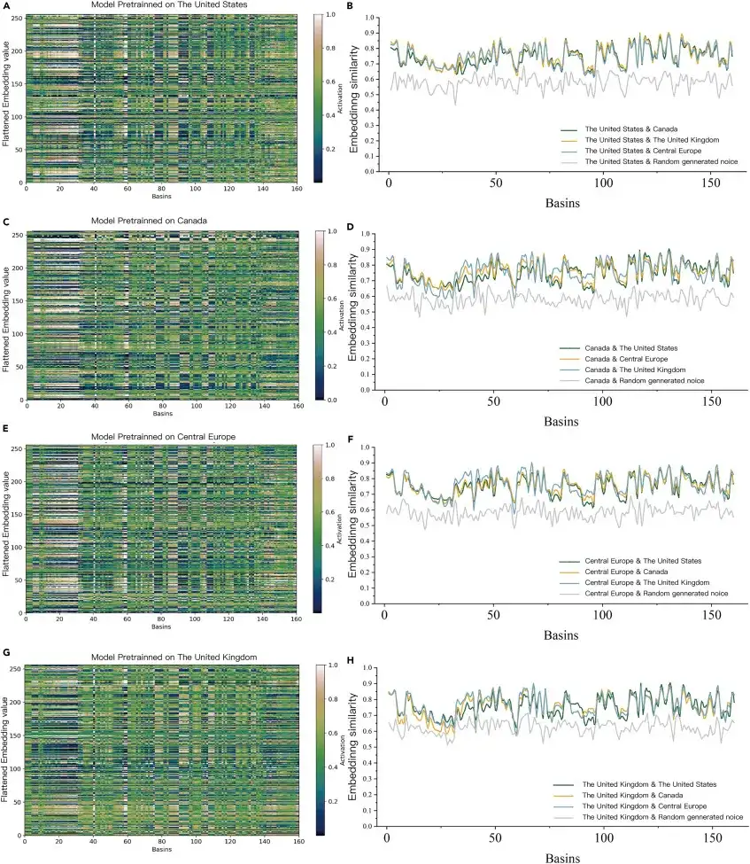 When the pre-trained model was used to predict 160 watersheds in Chile without monitoring data, the characteristics of each watershed were visualized (left side of the figure below) and similarity analyzed (right side of the figure below) using the ED-DLSTM encoder. It was found that the average encoding similarity between the pre-trained models was 38.4% higher than that of random noise, indicating that the embedding layer of ED-DLSTM is not a disordered random signal, but a high-dimensional feature information recognized and utilized by the model.It proves that AI can learn "hydrological knowledge" in different river basins.