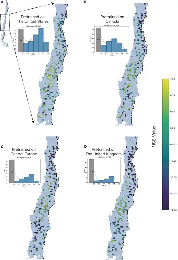 Based on the pre-trained models of the above four regions (Northern Hemisphere), the researchers made predictions for 160 new and unfamiliar basins in Chile (Southern Hemisphere) (without any historical monitoring data training) to test the model's prediction ability in basins without monitoring data. The results are shown in the following figure: