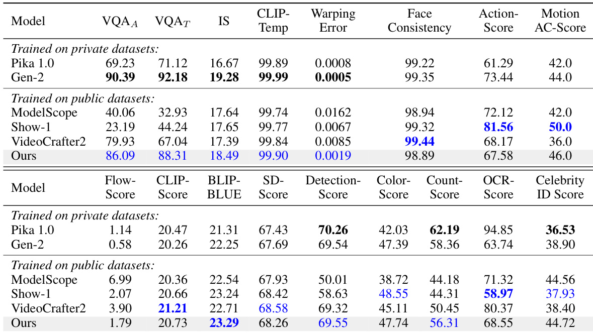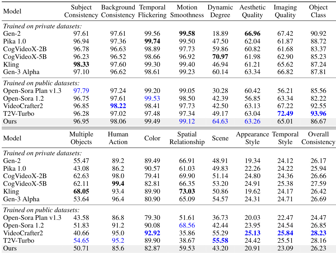 - On VBench and EvalCrafter benchmarks, the model surpasses all open-source text-to-video baselines, achieving a quality score of 84.74 (vs. 84.11 for Gen-3 Alpha) and top-2 motion AC and dynamic degree scores, despite training only on public data and using a 2B-parameter model initialized from SD3-Medium.