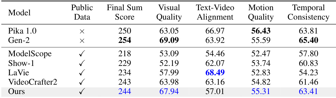 The authors use a pyramidal flow matching framework to achieve efficient video generation, significantly reducing computational and memory requirements compared to full-sequence diffusion. Results show that their model, trained on public datasets, outperforms several open-source and commercial baselines in key metrics such as motion quality and visual fidelity, achieving competitive performance with models trained on larger proprietary data.