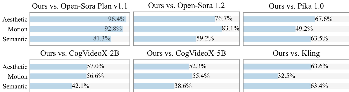 The authors use a user study to compare their model against several baselines, including Open-Sora, CogVideoX, and Kling, evaluating aesthetic quality, motion smoothness, and semantic alignment. Results show that their model is preferred over open-source models like Open-Sora and CogVideoX-2B, particularly in motion smoothness, due to the efficiency gains from pyramidal flow matching enabling higher frame rates. It also achieves competitive performance against commercial models like Kling and Gen-3 Alpha, especially in motion quality and visual aesthetics.