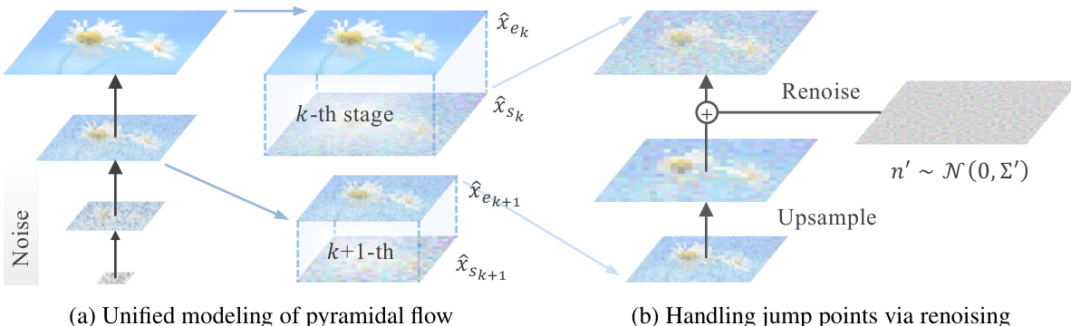 The unified modeling of the pyramidal flow is achieved by defining a conditional probability path that interpolates between different noise levels and resolutions. This path is constructed by sampling endpoints at each stage, where the starting point is derived from a lower-resolution, upsampled version of the clean data, and the ending point is a noisy version of the higher-resolution data. To ensure the flow trajectory is straight and the probability path is continuous, the authors enforce the noise at the endpoints to be in the same direction, which is achieved by sampling a single noise vector and using it to compute both endpoints. The flow model is then trained to regress the velocity field on this conditional vector field, which is the difference between the endpoints. This unified objective allows a single model to handle both the initial generation and the subsequent decompression or super-resolution steps, eliminating the need for separate models and facilitating knowledge sharing across stages.