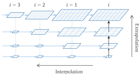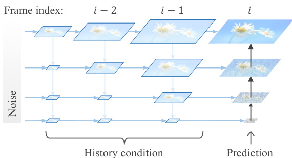 To further improve training efficiency, the authors introduce a temporal pyramid design for autoregressive video generation. This design reduces the computational redundancy in the full-resolution history condition by using compressed, lower-resolution history for each prediction. At each pyramid stage, the generation is conditioned on a history of past frames that are progressively downsampled in resolution. This significantly reduces the number of training tokens, as most frames are computed at the lowest resolution, thereby improving training efficiency. The position encoding is designed to be compatible with the pyramid structure, extrapolating in the spatial pyramid to preserve fine-grained details and interpolating in the temporal pyramid to ensure spatial alignment of the history conditions.