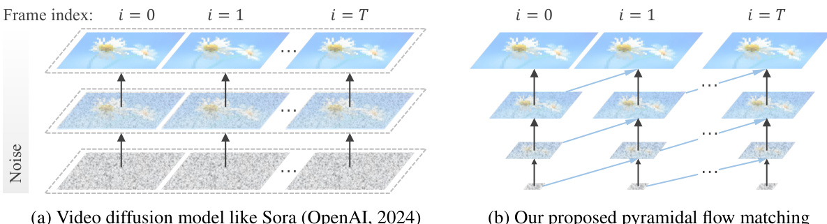Video generation using diffusion and autoregressive models has achieved impressive results in realism and duration, but remains computationally expensive due to the need to model large spatiotemporal data at full resolution. Prior approaches often rely on cascaded architectures that generate video in stages—first at low resolution and then upsampled with separate super-resolution models—reducing per-stage computation but introducing inefficiencies through disjoint training, limited knowledge sharing, and complex multi-model pipelines. The authors introduce pyramidal flow matching, a unified framework that leverages both spatial and temporal pyramids to compress video representations across scales. By reinterpreting the generation process as a sequence of interconnected stages operating at progressively finer resolutions, the method enables end-to-end training within a single Diffusion Transformer, eliminating the need for separate models. This design allows simultaneous generation and decompression while drastically reducing the number of tokens during training—cutting computational load by up to 87% for 10-second videos—without sacrificing quality, as demonstrated on benchmark datasets.